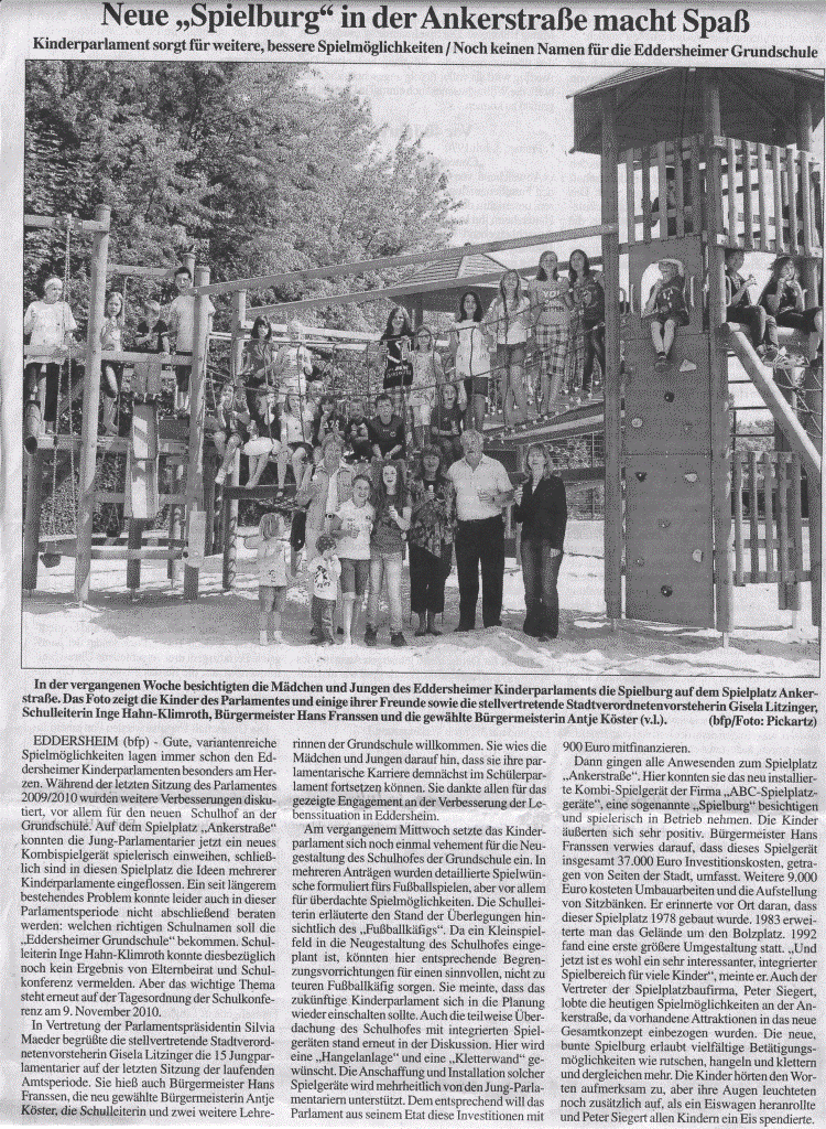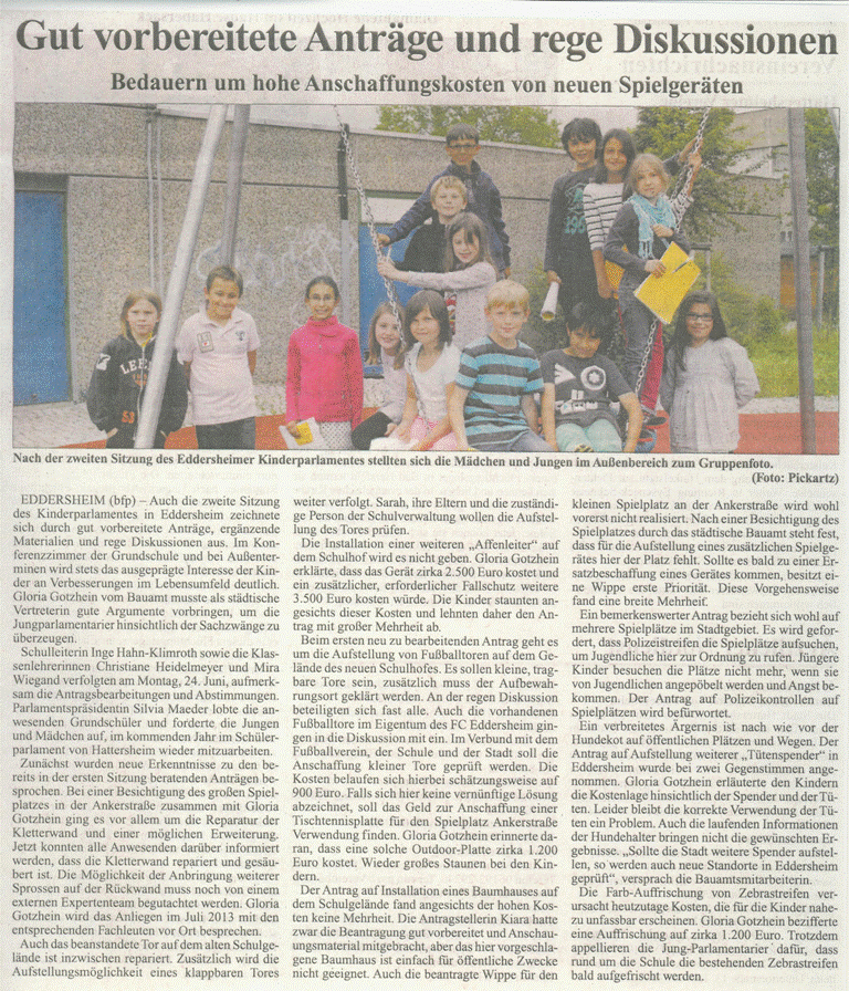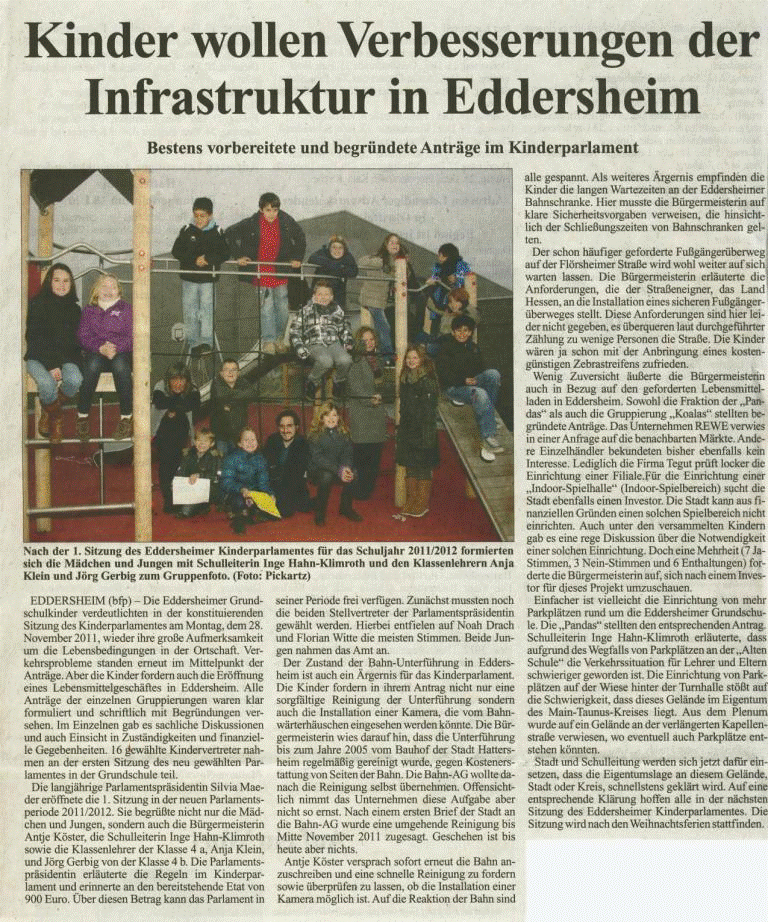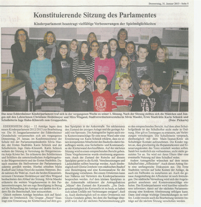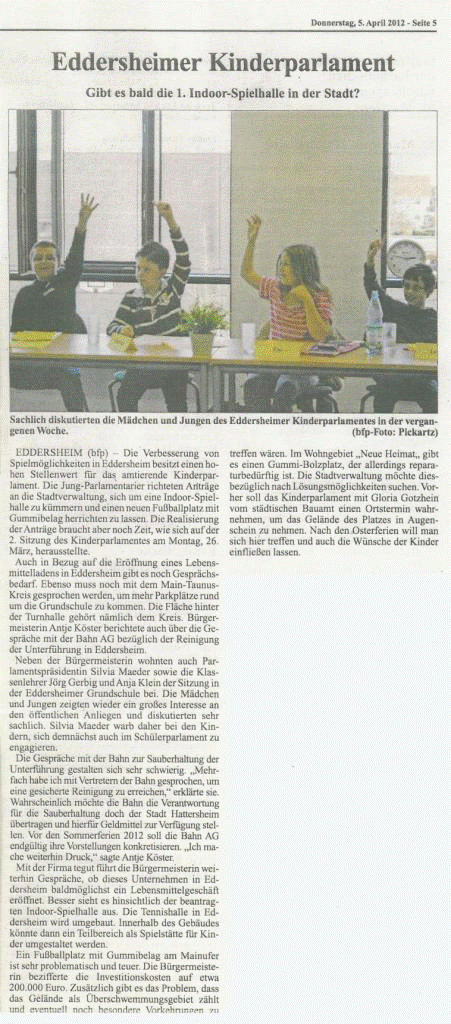 Die Anträge, die im Kinderparlament gestellt und besprochen werden, formulieren die Viertklässler*innen im Sach- und Deutschunterricht. Alle Kinder sind als Zuschauer bei den Sitzungen willkommen. Sie erfahren im Kinderparlament, dass auch ihre Wünsche ernst genommen werden und sie Eddersheim nach ihren Vorstellungen mitgestalten können.