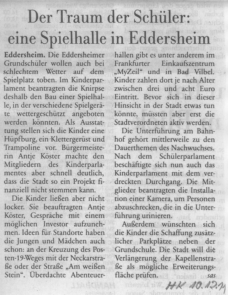 Hattersheim war eine der ersten Kommunen, die ein Kinderparlament eingerichtet haben. Das Projekt besteht nun seit vielen Jahren. In Hattersheim gibt es zurzeit insgesamt drei Kinderparlamente, eines davon in Eddersheim.